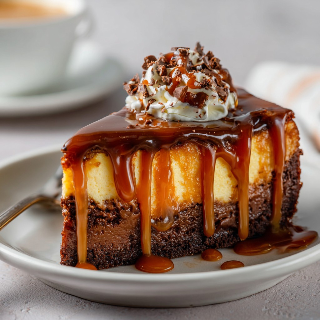 A decadent dessert combining fudgy brownie, creamy cheesecake, and swirls of caramel sauce.