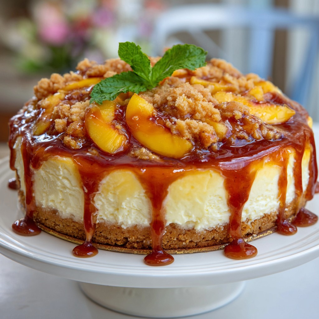 A delightful fusion of creamy cheesecake and warm peach cobbler, perfect for summer desserts.